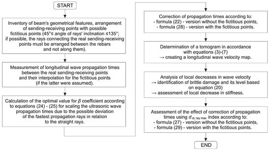 The accuracy of transmission ultrasonic tomography for the detection of brittle damage in concrete beams can be effectively supported by the graph theory and, in particular, by Dijkstra’s algorithm. It allows determining real paths of the fastest ultrasonic wave propagation in concrete containing localized elastically degraded zones at any stage of their evolution. This work confronts this type of approach with results that can be obtained from non-local isotropic damage mechanics. On this basis, the authors developed a method of reducing errors in tomographic reconstruction of longitudinal wave velocity maps which are caused by using the simplifying assumptions of straightness of the fastest wave propagation paths. The method is based on the appropriate elongation of measured propagation times of the wave transmitted between opposite sending-receiving transducers if the actual propagation paths deviate from straight lines. Thanks to this, the mathematical apparatus used typically in the tomography, in which the straightness of the fastest paths is assumed, can be still used. The work considers also the aspect of using fictitious wave sending-receiving points in ultrasonic tomography for which wave propagation times are calculated by interpolation of measured ones. The considerations are supported by experimental research conducted on laboratory reinforced concrete (RC) beams in the test of three-point bending and a prefabricated damaged RC beam.