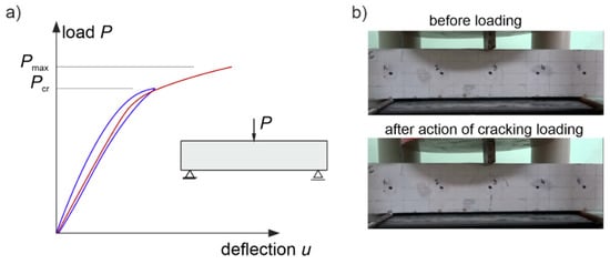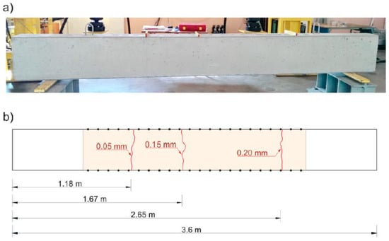 (a) Picture of the beam (the places of visible cracks are marked with the slats put on the upper surface of the beam). (b) Shape and width of the visible cracks.