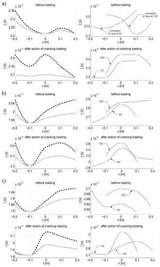 Propagation times and between the transmitting/receiving points in the beams before and after an action of cracking load: (a) No. 1, (b) No. 2, and (c) No. 3. The results are presented as a function of the position of the transmitting points: a grey line with nodes marked with circles, and a black, dashed line. The diagrams on the left refer to the paths connecting the opposite points and those on the right to the points lying diagonally at an angle of and to each other in relation to the axis .