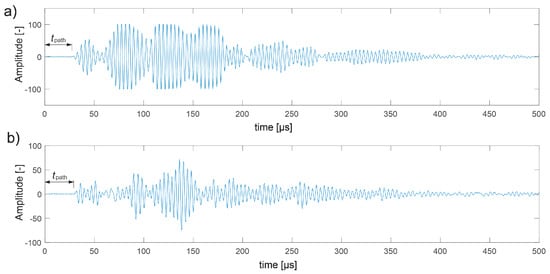 Example of signal recorded by the receiving head (transmitting point No. 4 and receiving point No. 3 in beam No. 3): (a) before load; (b) after an action of cracking load.