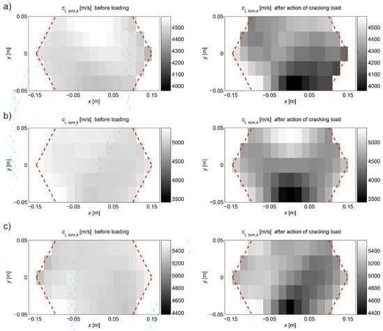 Tomographic reconstructions of the distribution of wave velocity according to Equation (3) in the longitudinal section of the beam before and after an action of the cracking load: (a) No. 1, (b) No. 2, and (c) No. 3 (red dotted lines—explanation in the text).