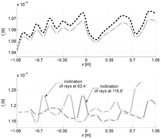 Propagation times and between the transmitting/receiving points in the beam. The results are presented as a function of the position of the transmitting points: grey lines with nodes marked with circles, and a black dashed line. The top diagram refer to the paths connecting the opposite points and the bottom one to the points lying diagonally at an angle of and to each other in relation to the axis .