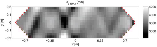 Tomographic reconstructions of the distribution of wave velocity according to Equation (3) in the longitudinal section of the beam (red dotted line—explanation in the text).