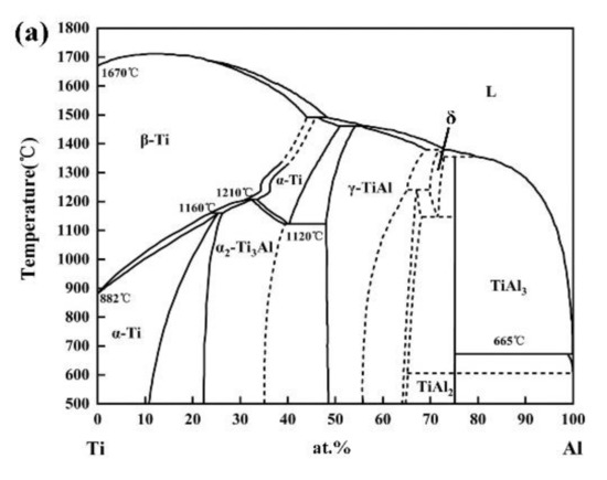 - Ohnuma, I.; Fujita, Y.; Mitsui, H.; Ishikawa, K.; Kainuma, R.; Ishida, K. Phase equilibria in the Ti-Al binary system. Acta Mater. 2000, 48, 3113–3123. [Google Scholar] [CrossRef]