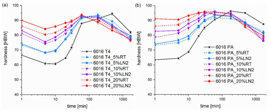 Figure 1. Ageing kinetics of alloy (a) EN AW 6016 naturally aged (T4) and (b) EN AW 6016 pre-aged (PA) at 185 °C after 0%, 5%, 10% and 20% deformation at 25 °C (RT, solid lines) and −196 °C (LN2, dashed lines).