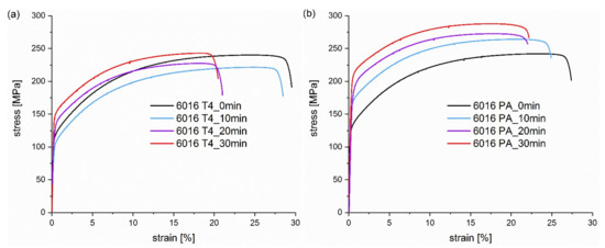 Figure 2. Tensile testing curves of alloy (a) EN AW 6016 T4 and alloy (b) EN AW 6016 PA heat treatment times from 0 min to 30 min at 185 °C.