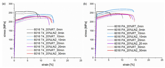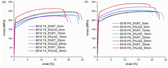 Figure 5. Tensile testing curves of alloy (a) EN AW 6016 T4 and alloy (b) EN AW 6016 PA pre-deformed for 20% at RT (dashed curves) and LN2 (solid curves). The curves in the individual diagrams result from different pre-deformation temperatures and heat treatment times from 0 to 30 min at 185 °C.
