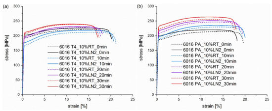 Figure 4. Tensile testing curves of alloy (a) EN AW 6016 T4 and alloy (b) EN AW 6016 PA pre-deformed for 10% at RT (dashed curves) and LN2 (solid curves). The curves in the individual diagrams result from different pre-deformation temperatures and heat treatment times from 0 min to 30 min at 185 °C.