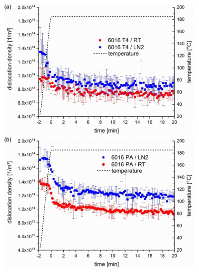 The sample EN AW 6016 T4 (Figure 6a) shows slightly higher dislocation densities in the first few minutes of the paint bake process than the RT deformed samples, which reduce following the heat treatment. However, this is can only be observed by trend and is near to the scatter of the measurement. In contrast, sample EN AW 6016 PA in Figure 6b shows, throughout the measurement, a significantly greater dislocation density at LN2 deformation. This difference is greatest in the first few minutes of the heat treatment and remains approximately constant from 5 min onward, while the dislocation densities slightly decrease.