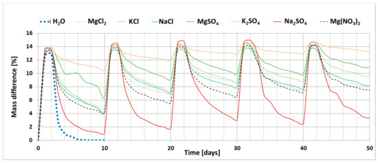 The process of drying ceramic bricks saturated with distilled water under the set laboratory conditions leads to complete water removal. The presence of salt, on the other hand, clearly limits the possibility of this material drying out. Sodium sulphate has the least influence on the drying process. At the end of the experiment, i.e., after five cycles, the weight increase for the sample saturated with this salt is 3.3%. On the other hand, the greatest changes were recorded for potassium sulphate; weight gain of the sample saturated with this salt after the end of the experiment is 13.3%. A large weight gain was also recorded for magnesium sulphate, which is 11%. The remaining salts, including all magnesium chloride and nitrate salts, have a weight gain of 7.5–9.5%.