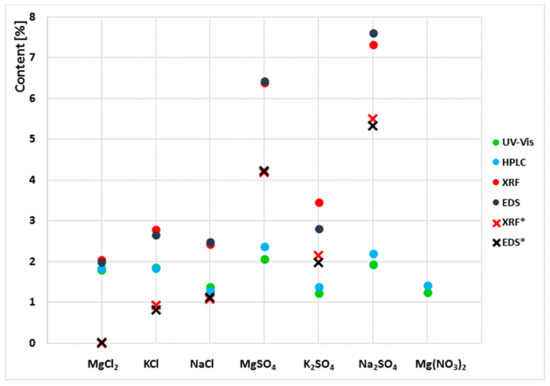 As stated in the introduction, the test methods applied in the paper can be divided into two main groups. One of them comprises methods for testing aqueous extracts, and the other one comprises methods for solid samples (powdered samples). The results obtained clearly indicate differences in sulphate and chloride contents depending on the test method applied. In all cases, the results obtained by X-ray fluorescence (XRF) and energy-dispersive X-ray spectroscopy (EDS) for solid-phase samples are higher than those obtained by ion chromatography (HPLC) and spectrophotometry (UV) for water extracts. For chloride salts, the differences are much smaller, while for sulphate salts, the differences are significantly higher. Note that the results of tests of salt content in liquids made by the two methods are very similar, and likewise the results of tests of solid samples are also very similar. For the NaCl and KCl salts, the results for chloride content determined by the UV and HPLC are almost identical, and so are the results of the chloride content obtained by EDS and XRF. For example, the chloride ion contents in the sample exposed to NaCl salt determined in the aqueous extract are 1.29% and 1.38% of the mass while for the powdered sample they are 2.43% and 2.49% of the mass. The results of tests on samples exposed to sulphate salts are also similar; the results of UV and HPPLC tests for aqueous extracts are very similar like the results of solid-phase tests with EDS and XRF, which are similar too. Nevertheless, the differences between the results depending on the form of the sample are very large, e.g., for Na2SO4, the SO42− ion content in the sample determined in the aqueous extract is ~2% while in the powdered sample it is ~7%. This gives a 300% difference in the results obtained depending on the determination method used. The highest consistency of results, regardless of the test method (EDS, XRF, UV or HPLC), was obtained for samples exposed to the MgCl2 salt. For this sample, the discrepancy between the results does not exceed 5%.