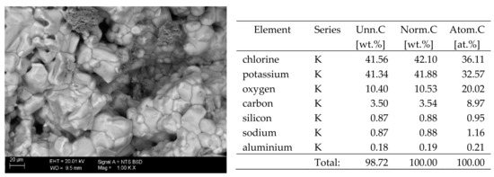 SEM image of the microstructure of KCl crystals visible on the surface of the bricks tested; 1000× magnification. Next to it is a screenshot an EDS analysis for presence of crystals.