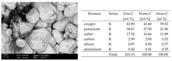 The basic difference in the microstructure of the salts formed is the size of the crystals and their shape. The finest are sodium sulphate crystals. They take the form of oval fine crystals with dimensions not exceeding a few μm. Magnesium sulphate crystals are also fine. Potassium sulphate crystals, which is well crystallised with clear edges, has an interesting form. Their size ranges from several micrometres to ~150 μm. The largest are magnesium nitrate crystals, which can be even 2–3 mm long. They crystallise in two forms; the first one (the dominant one) is characterised by elongated, oval shapes and the second one by spherical forms with a diameter of up to ~100 μm (Figure 10).