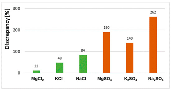 One reason for the lack of homogeneity of the results concerning the chloride and sulphate ion content determined in aqueous extracts and powder samples is the different solubility of each salt in water. Sodium, potassium and magnesium chloride salts have higher solubility in water than sulphate salts of the same metals. The solubility of magnesium, sodium and potassium chloride is 55 g, 36 g and 34 g/100 g H2O at 20 °C, respectively, whereas that of magnesium, sodium and potassium sulphate is 35 g, 20 g and 11 g/100 g H2O, respectively. On the other hand, the solubility of magnesium nitrate is the highest of the salts tested, at 70 g/100 g H2O. Of the chloride and sulphate salts tested, MgCl2 solubility is the highest. In the case of this salt, the results of the chloride content are very similar regardless of the test method used, and the difference between them is only 11% (Figure 11). The high solubility of magnesium chloride makes it easy to leach chloride salts from the ceramic matrix into the solution. This promotes the transition of all chlorides from the sample to the aqueous extract. In effect, the results for the chloride contents determined in the extract and in the solid phase (in the powder sample) are the same. However, in the case of low solubility, e.g., for sodium and potassium sulphate, the differences in results between samples (extract, solid sample) are very large. This means that some of the sulphates are not washed out and remain in the solid phase. They are not detected in the water extracts. Moreover, as the authors of the paper have shown [22], it is difficult to rinse the total amount of salt from the brick and is determined by such factors as fragmentation of the sample and the soaking time.