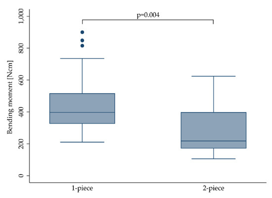 In order to compare the aforementioned groups (1–6, depending on load and cycles) for heterogeneity of the data, both inter- and intra-standard deviations with 95% confidence intervals (Cis) were computed. In addition, the cohort-specific standard error of the bending moment was used for weighting. Furthermore, box plots were created for visualization of the data. The data were analyzed with STATA 16.1 (StataCorp LLC, Texas, TX, USA).
