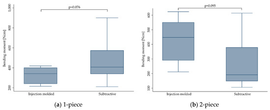 Boxplots showing the bending moment at the time point of fracture depending on the manufacturing method for 1- (a) and 2-piece (b) zirconia implants. Whiskers are used to represent all samples lying within 1.5 times the interquartile range. Detailed data can be found in Table 3 and Table 4.