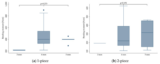 No statistically significant difference could be calculated for the bending moment at the time point of fracture regarding the implant diameter ranging from 3 to 5 mm (p = 0.327). This did not change when stratifying the outcome for 1- (p = 0.273) and 2-piece (p = 0.191) implants. However, the included studies evaluated only very few implants in the range of 3 mm (range: 3.0–3.3 mm; n = 15, 207.2 ± 14.3 Ncm) [24,27] and 5 mm (range: 4.5–5.0 mm; n = 41, 349.4 ± 125.4 Ncm) [15,19,27,28], whereas the majority of implants had a diameter in the range of 4 mm (range: 3.8–4.4 mm; n = 675, 394.9 ± 170.4 Ncm). Boxplots can be seen in Figure 5.
