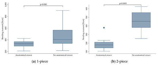 Boxplots showing the bending moment at the time point of fracture depending on the crown supply for 1- (a) and 2-piece (b) zirconia implants. Whiskers are used to represent all samples lying within 1.5 times the interquartile range. Dots represent outliers. Detailed data can be found in Table 3 and Table 4.