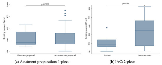 Boxplots showing the bending moment at the time point of fracture depending on the abutment preparation for 1-piece (a) and depending on the implant-abutment-connection (IAC) for 2-piece (b) zirconia implants. Whiskers are used to represent all samples lying within 1.5 times the interquartile range. Dots represent outliers. Detailed data can be found in Table 3 and Table 4.