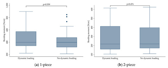 Boxplots showing the bending moment at the time point of fracture depending on dynamic loading (Yes: Implants were subjected to dynamic loading, No: Implants were not dynamically loaded) for 1- (a) and 2-piece (b) zirconia implants. Whiskers are used to represent all samples lying within 1.5 times the interquartile range. Dots represent outliers. Detailed data can be found in Table 3 and Table 4.
