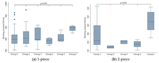 In order to evaluate the impact of different dynamic loading procedures (implants were subjected to prior to fracture loading) on the outcome (bending moment), groups as indicated in Section 2.7 were analyzed for heterogeneity. As a result, standard deviation as a measure of variation within and in between the included studies revealed to be within the same range (Table 2). No heterogeneity of the bending moments for groups 1–6 was found, even if a decreased mean value for group 3 was calculated (p = 0.612). This did not change when stratifying the implants according to their design (1-piece: p = 0.951; 2-piece: p = 0.056).