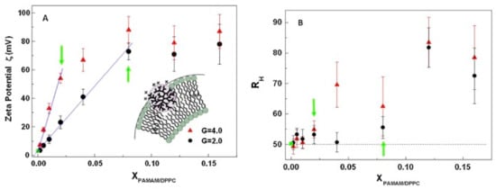 Measurements of: (A) Zeta potentials of extruded liposomes as a function of dendrimer-liposomes concentration, for G2-Poly(amidoamine) (PAMAM) and G4-PAMAM dendrimers. (B) Hydrodynamic radius of PAMAM-liposomes mixed system. This Figure was provided thanks to Reference [81].