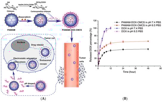 Dendrimers as DDS can improve key points in transport and biodistribution such as prolongation of the drug circulation time, enhance drug solubility, enhance tumor permeation and retention, protection of the drug from surroundings, and the ability to target diseased tissue, among others. As a strategy to minimize the cytotoxicity of PAMAM dendrimers, the positive surface charge of its surface has been modified with carboxymethyl chitosan (CMCS) [90,91,92]. Considering that, CMCS is an amphoteric polymer, sensitive pH, and taking doxorubicin as a model drug for cancer, it is that the formulation of a nanoparticle between PAMAM dendrimer and CMCS based on electrostatic conjugation, can transport the drug and release it into the target tissue (Figure 3A). It is known that there is a slight difference between physiological pH (7.4) and extracellular pH of tumor cells (6.5), (Figure 3B) so PAMAM dendrimers decorated with CMCS showed promising in vitro results of doxorubicin release at pH 6.5.
