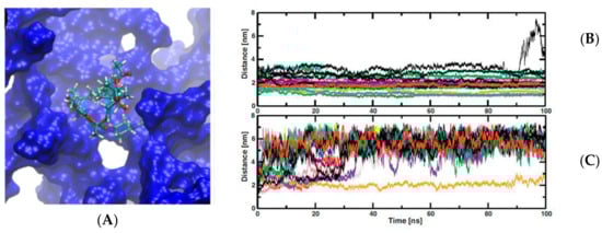 (A) a rifampicin (RIF) molecule inside one cavity of PAMAM dendrimer from molecular dynamic trajectory. (B,C) charts time of simulations against distance between center of mass of RIF molecules and dendrimer center of mass. (B) at neutral pH and (C) at low pH. This Figure was provided thanks to Reference [94].