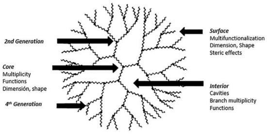 Dendrimers are very attractive macromolecules, both from the challenge proposed by their design and chemical synthesis and from the range of applications they have given in different areas. They are three-dimensional structures highly branched and radially symmetrical (Scheme 1). They have three very well defined structural regions, a central junction structure (core) with multiple internal repeating units covalently linked to the nucleus (called generations, G), and finally, a terminal chemical structure that forms the multifunctional surface of a dendrimer [17]. These attractive macromolecular architectures were reported in the late 70’s by Vögtle et al. and have been the subject of numerous studies since then. In later years Tomalia, Newkome, and Frechet, independently, reported two new synthetic routes to obtain dendrimersoma [18,19]. The chemical architecture of the dendrimers overcome other polymers (linear, branched or cross-linked) since they have attributes like monodisperse structures (desirable for applications in nanomedicine), control over macromolecular growth, multifunctional surface structure, internal cavities available to host small molecules, increased solubilization, among many other advantages that enable them to be used in several fields. Nanomedicine is one of the applications in which dendrimers have been studied and tested, using as a nanocarrier bioactive molecules, imaging agents, or transfection of genes.