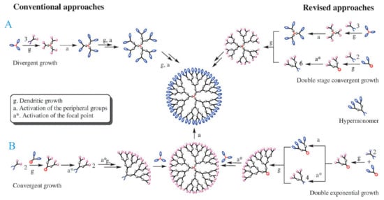 Simplified representation of dendrimers synthesis by (A) divergent and (B) convergent strategies. This scheme was provided thanks to Reference [26].