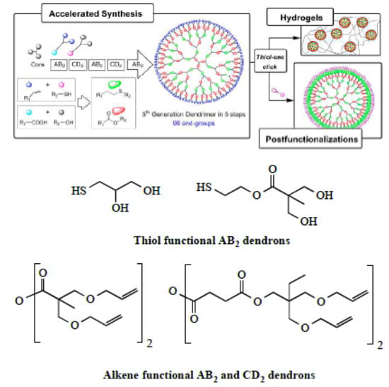 The “click” chemistry methodology allows obtaining new compounds of biological interest from highly energetic reagents through a series of highly thermodynamic and orthogonal processes. These two characteristics, high reactivity and orthogonality, allow the click-type reactions to proceed with quantitative yields and, therefore, only simple purifications are required. “Click” chemistry is a synthetic methodology remarkable which its care with the environment since it only generates as a by-product sodium chloride, mainly [30]. This reaction mechanism has been used both syntheses and modification of polymer and materials [31]. Divers types of polymers can be obtained by this strategy, specifically through called “thiol-ene” chemistry reactions. In recent years, “thiol-ene” chemistry has been used to synthesized dendrimers, star polymers and hyperbranched polymers. A comprehensive review by Lowe [31], describes the reaction mechanisms of “thiol-yne” click coupling chemistry, and their applications in dendrimers synthesis using different combinations of AB2 and CD2 monomers (see Scheme 3). In the same way, Amir et al. [32] carried out a “click” strategy to obtain fourth-generation dendritic scaffold with two dyes attach internally with coumarin units through a cleavable linker and on superficial region with Alexa647 dye. In addition, some protonated amino groups remained on the surface of the dendritic system, which allows the internalization of the system within the cells. This strategy allowed the monitoring of the dendritic scaffold within the cellular environment, and the appearance of fluorescence could also be observed, due to the release of coumarin dye to the hydrolytic enzyme cleavage inside the cell (Figure 1). This type of thiol-yne and thiol-epoxy synthesis reaction strategy allows versatility to obtain dendritic platforms for transport and release of drugs to target tissues.