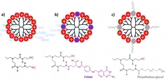 Schematic representation of G4-PAMAM functionalized with polyethylene glycol (PEG), and folate terminal groups: (a) G4-PAMAM dendrimer with positively charged superficial groups; (b) G4-PAMAM dendrimer functionalized 25% folate end-groups, and (c) G4-PAMAM dendrimer functionalized 25% PEG on the surface. This scheme was provided thanks to Reference [86].