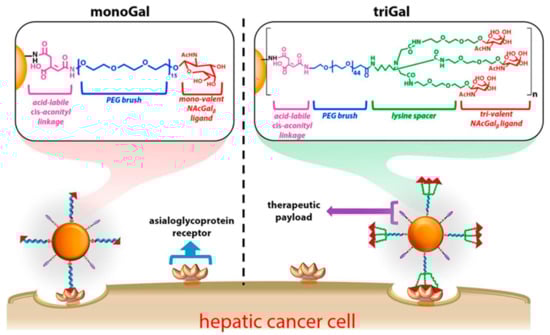 Studies about hepatic cancer have determined that asialoglycoprotein receptor (ASGPR) is specifically overexpressed on tumor cells, and shown high binding affinity with glycoproteins [99,100]. The above can be considered as an advantage because key parts of the glycoproteins can be obtained and grafted on the surface of nanoparticles (NP) to promote high-efficiency binding to hepatic tumor cells. N-acetylgalactosamine (NAcGal) ligands on a NP surface achieves selective intake into hepatic cancer cells [101,102,103]. Moreover, Kurivilla et al. synthesized G5-dendrimers containing NAcGal ligands tri-valent (NAcGal3) attached to the surface through a PEG linker and measured their ability to achieve hepatic cancer cells in comparison to mono-valent ligands [104] (Scheme 6).