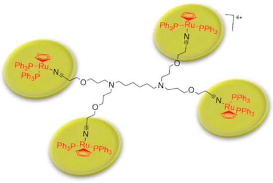 Schematic representation of metallodendrimer base on poly(alkylidenimine) dendrimer core containing nitrile groups and functionalized with [Ru(η5-C5H5)(PPh3)2Cl] compound. This scheme was provided thanks to Reference [105].