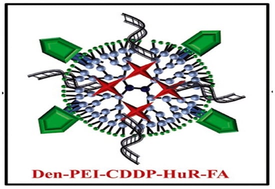 Therapeutic nanoformulation based on polyethyleneimine dendrimer functionalized with folic acid (FA), human antigen R (HuR), and cis-diamine platinum (CDDP). This scheme was provided thanks to Reference [109].