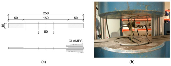Twenty (20) specimens of rigid GFRP sheets with a nominal section of 2.15 × 15 mm and 250 mm of total length were produced using infusion techniques. For that, unidirectional 'E-Glass' fibers were embedded using high-pressure vacuum in an isophthalic unsaturated polyester resin. At the heads of test specimens, 50 mm beads were placed to avoid deterioration when the jaws of the test machine were tightened (Figure 1a). The UNI-1200 GFRP sheets (UNI-1200 indicates unidirectional fibers with an areal mass of 1200 g/m2) manufactured in this way, which have an areal mass of 1200 g/m2 and a mean thickness of 2.15 mm, were subjected to tensile tests in accordance with ISO 527-5/B [52] using an INSTRON MEN-102/100 testing machine equipped with a 1000 kN load cell and pneumatic clamps. Strain was measured with an IBERTEST IB-MFA 2 strain gauge with a 2 mm span (Figure 1b). A displacement rate of 1 mm/min was employed during testing.