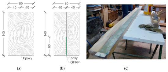 For each duo beam type, thirty (30) specimens were manufactured in a carpentry workshop. The planks from humidity-conditioned stock were first cut with nominal dimensions of 40 × 140 × 2500 mm (Figure 2a,b) and later prepared via knife plane work at least 48 hours before bonding. In addition, a recess was cut on one of the timber planks to lodge the GFRP sheet (Figure 2c) without changing the external dimensions of the reinforced duo beam. Later, both planks were bonded with epoxy resin Sikadur-30 to produce duo timber beams, including a UNI-1200 GFRP sheet inside the glue line in a vertical position, only in the reinforced duo beams. The epoxy resin temperature was monitored throughout the gluing process to control the maximum pot life of the mixed resin. Over assembled duo timber beams were applied a constant pressure of 0.5 Mpa during a curing time of 48 h. The mean amount of epoxy resin applied was 1500 g/m2.