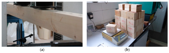 After finishing the test campaign, a specimen with a length of 80 mm was sawn from each broken beam (Figure 3b), and the real moisture content and wood density were obtained by the oven drying method in accordance with EN 13183-1 [56]. With this real moisture content values, the bending modulus of elasticity of each beam was corrected according to factors proposed in standard EN 384 [46].
