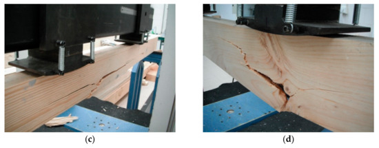 Typical fracture of maritime pine duo beams under bending tests: (a and b) unreinforced duo beam at failure and (c and d) duo beam reinforced with a UNI-1200 GFRP sheet at failure.