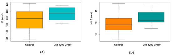 Box plot graphics of mechanical properties: (a) bending stiffness EI (kN·m2) and (b) ultimate moment capacity Mult (kN·m). Note: A color-friendly palette (orange/blue) was used to assist color-blind readers.