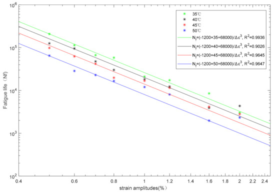 The fatigue life test results for various temperatures and strain amplitudes are listed in Table 3. At four different temperatures, the scatter plots of strain amplitude and fatigue life are obtained in Figure 3 with log-log coordinates. The fatigue life is calculated as follows by regression of the experimental results.