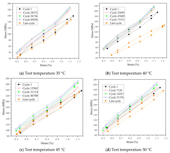 Figure 7 shows the effects of temperature on stress amplitude at strain amplitudes of 0.6%. The stress amplitude increases with the increasing of the test temperature, from about 126.9 MPa at 35 °C, 144.0 MPa at 40 °C, 150.8 MPa at 45 °C to 162.3 MPa at 50 °C for the first cycle loading. The stress amplitude increases slowly as cycle number increases. When the cycle number is 10 k, the stress amplitude is 139.4 MPa, 153.4 MPa, 159.0 MPa, and 177.9 MPa.