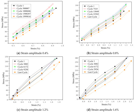 Hysteretic curves of different strain amplitudes: (a) 0.4%, (b) 0.8%, (c) 1.2%, and (d) 1.6%.