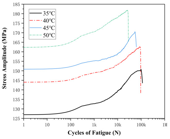 When SMA is used in a damper for civil engineering structures, its service life and durability become the major focus of engineering society. SMA components are often subjected to continuous cyclic loads in engineering applications, which means the fatigue problem of SMA must be considered to ensure the safety and durability of the structure in practical applications [15]. Most of the reported researches are achieved by controlling stress amplitude [16,17] or strain amplitude [18,19,20] in the set working temperature, then the materials are cyclically loaded to failure [21,22]. As we all know, the working environment is harsh for engineering structures, as the structures are exposed to the variation of environmental temperature; the effects of temperature on SMA fatigue performance cannot be ignored.