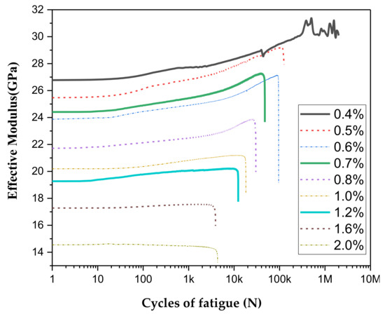 in which , . Fmax is the maximum value of a force in a cycle, Fmin is the minimum. lmax is the maximum value of the displacement in a cycle, lmin is the minimum, S is the cross-sectional area of the specimen, and l is the effective length of the specimen. The relationship between effective modulus and cycle number is shown in Figure 8. Equation (2) shows that the effective modulus is proportional to the stress amplitude, so the curve of the effective modulus and the curve of the stress amplitude have the same trend. It can be seen that the effective modulus of SMA specimens keeps a certain level during the test process. The effective modulus increases slowly with the increase of the test cycle, which means the ability to resist deformation gradually increases in this process. The effective modulus finally plunges rapidly when approaching to the failure. As can be seen from the previous section, the stress amplitude and strain amplitude are proportional, but the effective modulus is different from the strain amplitude. The effective modulus is inversely proportional to the strain amplitude. The larger the strain amplitude, the smaller the effective modulus. This is mainly due to the particularity of the SMA material. Stress induces a phase change and generates a phase change platform.