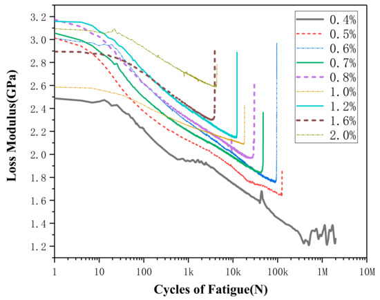 where is loss modulus, is Young’s modulus, and is phase angle (phase difference between the dynamic stress and the dynamic strain in a viscoelastic material subjected to a sinusoidal oscillation). Generally, the loss modulus value is proportional to the area enclosed by the hysteresis curve (stress–strain curves in Figure 4 and Figure 5).