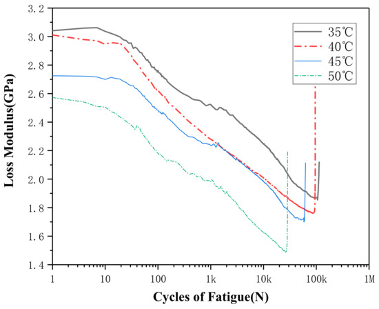 The loss modulus curves are shown in Figure 9 and Figure 10. As can be seen from figures, the loss modulus curves under all working conditions are similar. The loss modulus gradually decreases as loading cycle number increases, and then suddenly it rises sharply before it is about to be destroyed. Figure 8 reveals that the loss modulus has a gradual rise trend when the strain amplitude increases. On the contrary, it can be seen from Figure 10 that the loss modulus decreases when the temperature increases. Figure 8 show the loss modulus curve of 1.0% curve has not followed the trends, the reason may be due to fact that SMA is a sensitive smart material; it shows some kinds of uncertainty [28,29]. The uncertainty may come from the SMA material itself or during the test process: the production and heat treatment process, the training process of SMA before the test, test temperature, the initial stress during samples installation, etc.