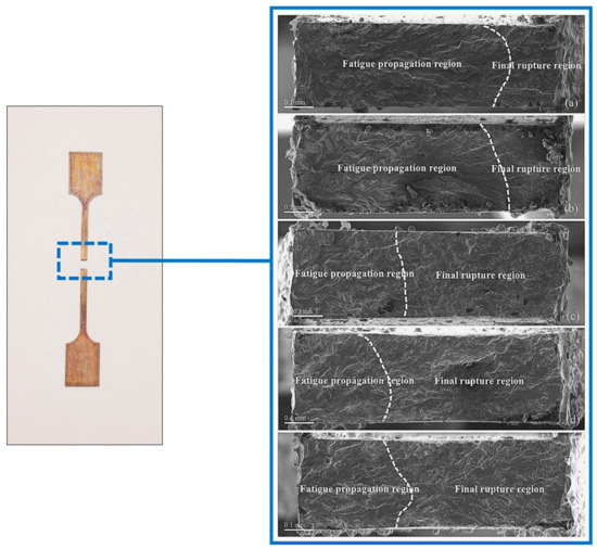 SEM micrograph of fracture of different strain amplitude: (a) 0.6%, (b) 0.8%, (c) 1.2%, (d) 1.6%, and (e) 2.0%.