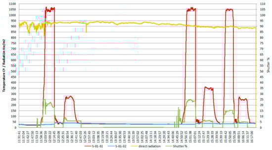 According to the data shown in Figure 3, which shows the variation of sample temperature, the direct irradiation, and shutter opening percentage, all as function of time, the average heating rate to reach the austenitization temperature was of ~3.5 °C/s, while the average heating rate for tempering was of ~1.5 °C/s, and the value of the solar radiation (Direct Normal Irradiance (DNI)) varied between 850 and 950 kW/m2.