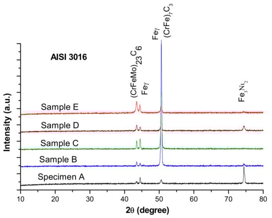 X-ray diffraction patterns of AISI 316 modified stainless steel samples.